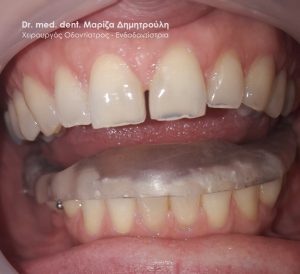 Αποτριβή δοντιών. Πολλοί ασθενείς που τρίζουν ή τρίβουν τα δόντια τους κατά τη διάρκεια του ύπνου ή της ημέρας προκαλούν αποτριβή του σμάλτου των δοντιών τους με συνέπεια την έκθεση της οδοντίνης των δοντιών και την παρουσίαση ευαισθησίας δοντιών. Οι οδοντίατροι στην προκειμένη περίπτωση συστήνουν την κατασκευή ενός νάρθηκα τρυγμού (μασελάκι) , το οποίο οι ασθενείς το φορούν κατά τη διάρκεια του ύπνου τους, με σκοπό την αποφυγή περαιτέρω εξέλιξης της καταστροφής των δοντιών.