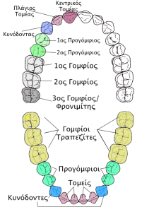 Τα πρώτα μόνιμα δόντια που ανατέλλουν στο στόμα ενός παιδιού είναι οι πρώτοι γομφίοι (τραπεζίτες) στην ηλικία των 6 ετών. Τα δόντια αυτά συνήθως δε γίνονται αντιληπτά από τους γονείς, γιατί εμφανίζονται πίσω από τα νεογιλά (παιδικά δόντια) χωρίς προηγουμένως να “πέσει” κάποιο παιδικό δόντι.