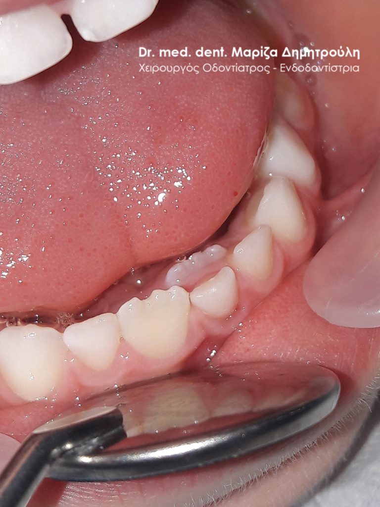 Μόλις το παιδικό δόντι πέσει, τότε το αντίστοιχο μόνιμο δόντι που βρισκόταν σε διπλή σειρά καταλαμβάνει τη φυσιολογική του θέση μέσα στο στόμα του παιδιού σε διάστημα περίπου 3 εβδομάδων.